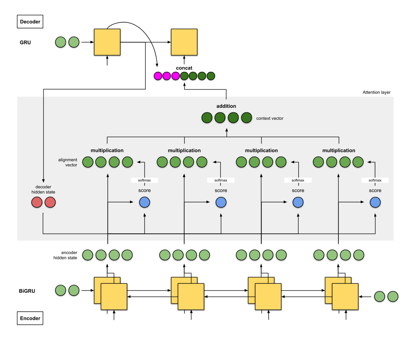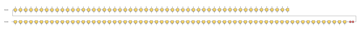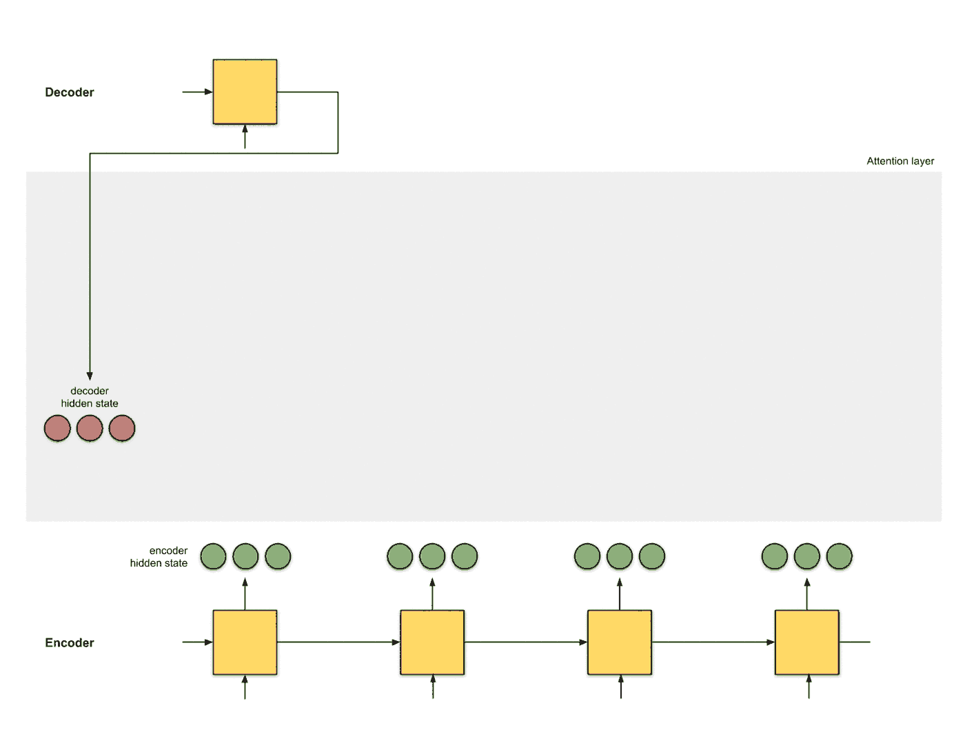 生成编码节点 将输入数据依次输入到RNN中, 得到编码器每个时间片的隐层状态的编码结果 (绿色), 并将编码器的最后一个输出作为解码器的第一个输入隐层状态 (红色, decoder hidden state):