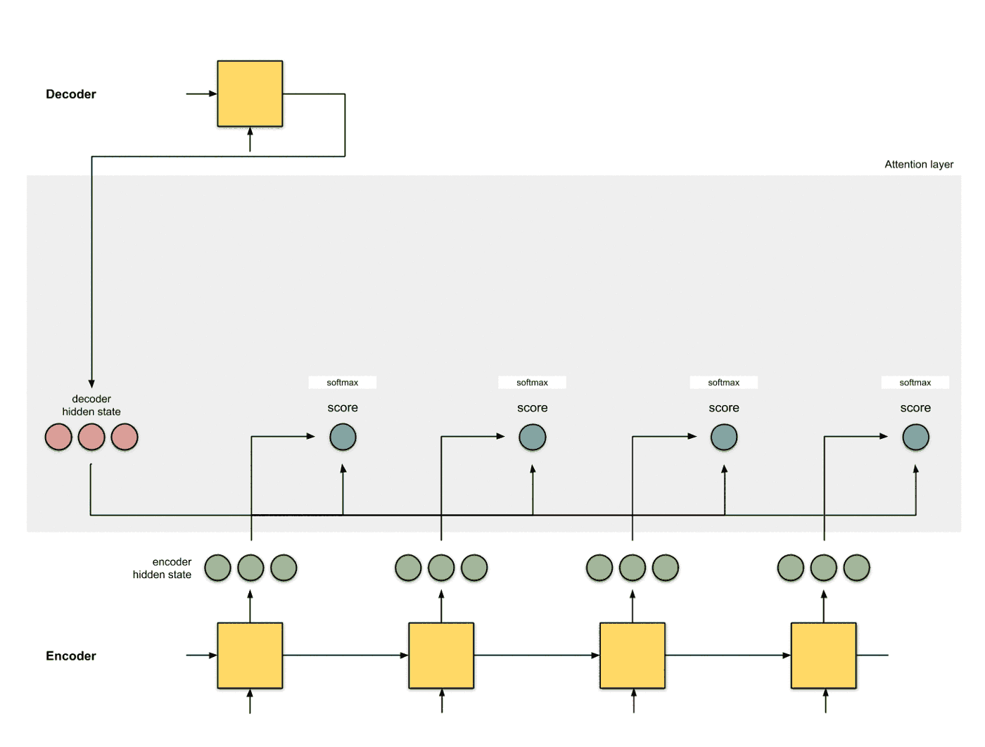 为每个编码器的隐层状态计算一个得分 使用当前编码器的当前时间片的隐层状态和解码器的隐层状态计算一个得分, 得分的计算方式有多种: