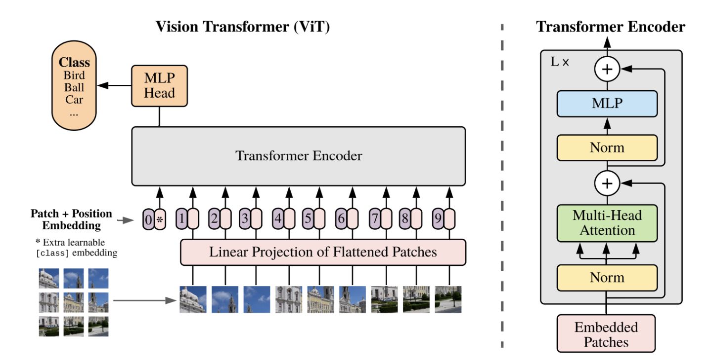 在整体的实现上, 原文完全使用原始bert的transformer结构, 主要是对图片转换成类似token的处理, 原文引入了一个patch的概念, 即将输入图片划分为一个个的patch, 然后对于每一个patch转换 (主要是flatten操作), 转换成类似bert的输入结构. 整体的框架如下图所示: